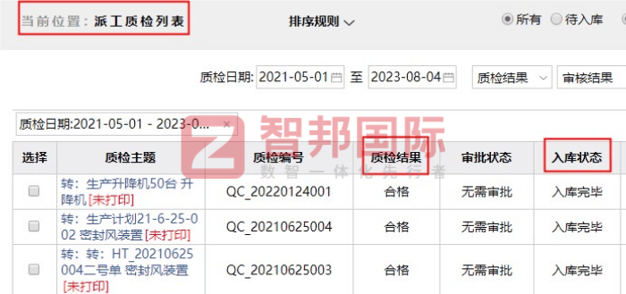 智邦一体化ERP天工系列派工质检列表(局部图)