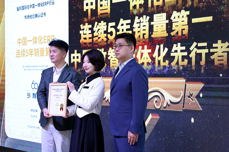 2023年8月4日,智邦国际获得由沙利文授予的“中国一体化ERP连续5年销量第一”和“中国数智一体化先行者”市场地位确认证书。
