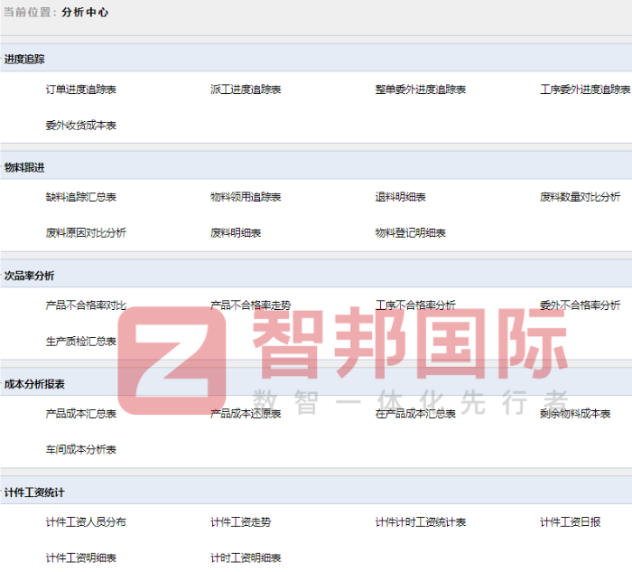 智邦一体化ERP生产版在生产功能板块有分析中心功能,为企业提供了一个方便快捷的数据通路和业务展示平台。分类呈现进度追踪、物料跟进、次品率分析、成本分析报表、计件工资统计等几个维度,可直接一键进入数据分析界面,直观了解该类目下的具体数据情况。同时,在底层数据一体化的环境下,数据可回溯、可深入挖掘,为管理人员综合管控业务提供了一体化数据分析管理平台。