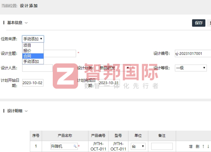 智邦一体化ERP天工系列让企业的产品设计管理井然有序。作为生产制造型企业,迭代、创新产品有助于企业不断研发更低成本、更好用的产品。产品设计作为整个产品生产流程中的重要一环,既需要企业综合发挥整合能力,又需要企业驱动管理流程更加精细化。在研发板块的设计中心功能中,用户可以直接添加设计任务,任务来源可以为项目、报价、合同,或者手动添加。在添加设计任务时,基于底层数据一体化的系统环境,可在设计明细中直接调取产品信息,操作简单且准确。在设计池中,还可以申请或者指派设计任务,信息能实时同步至相关环节的负责人,高效快捷。