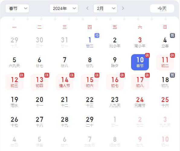 2024年2月10日(星期六,春节)至17日(星期六,初八)放假调休,共8天。2月4日(星期日)、2月18日(星期日)上班。放假期间若给您带来不便,敬请谅解!