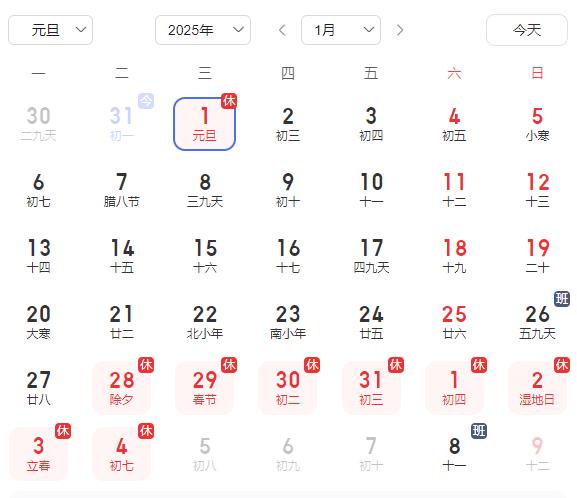 2025年1月1日(元旦,星期三)放假1天,不调休。1月2日(星期四)上班。放假期间若给您带来不便,敬请谅解!