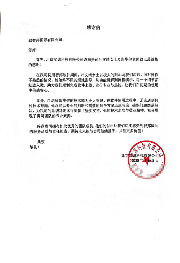 汉诚能源科技向智邦国际送感谢信