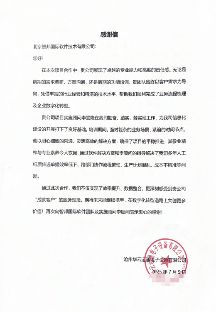 沧州华云运通电子设备有限公司签约智邦国际,希望通过智邦一体化ERP天工系列,搭建起覆盖生产、采购、库存、销售、财务等全业务链条的数字化管理平台,实现全流程数据贯通与实时共享,打破部门间信息孤岛。以智能化排产、精准成本监控及质量追溯体系,提升生产效率与交付质量,强化企业市场竞争力,驱动企业数字化转型加速。