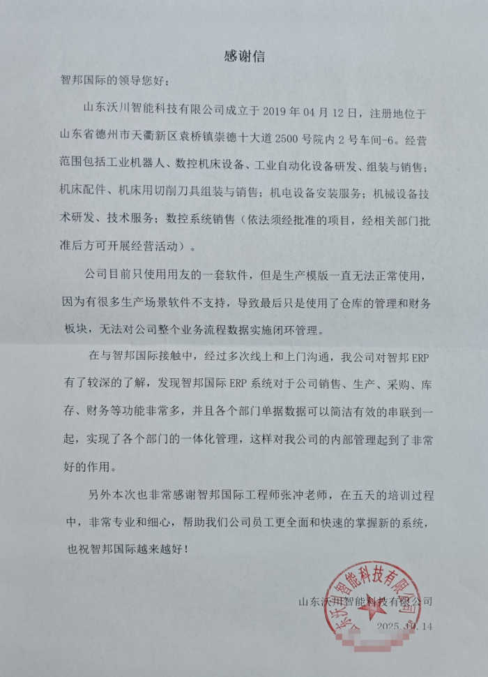 山东沃川智能科技有限公司签约智邦国际,希望通过智邦一体化ERP天工系列,打破企业在工业机器人、数控机床等智能装备研发生产中的信息孤岛,构建产销、业财、仓储一体化管理闭环,依托系统订单智能派工、物料精准管控、生产实时看板及成本自动核算等核心能力,实现从销售订单到生产交付的全流程协同,为企业数智化转型与智能制造业务规模化拓展筑牢管理根基。