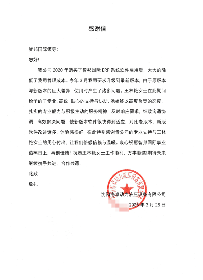海卓动力液压设备向智邦国际送感谢信